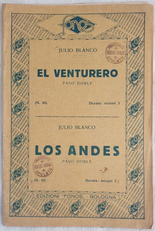 Partitura completa per orchestra del 1930 delle melodie di Julio Blanco "El venturero" e "los Andes".<BR>Copertina morbida editoriale. GENERE: Paso doble STRUMENTI: violini; violoncello; contrabasso, tromba, trombone, sassofono, clarinetto, flauto, batteria<BR>ANNO: 1930 DIMENSIONI: In 8. cm 27x18 PAGINE: pp. 20 CONDIZIONI: Buone condizioni. Ex libris in copertina Complete score for orchestra of 1930 of the melodies of Julio Blanco "El venturero" and "los Andes".. Editorial soft cover. MUSIC: Paso Doble STRUMENTI: violin; violoncello; contrabbass, trumpet, trombone, saxophone, clarinet, flute, drums YEAR: 1930z SIZE: In 8. cm 27x18 PAGES: pp. 20 CONDITIONS: Good conditions. Ex libris in the cover