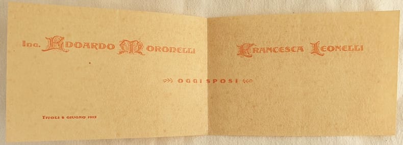 Bella partecipazione di nozze tra l'Ing. Edoardo Moronelli e Francesca Leonelli da celebrarsi a Tivoli il 6 giugno 1912. In ottime condizioni. Formato cm 10,5x32. Beautiful wedding card between l'Ing. Edoardo Moronelli e Francesca Leonelli to be celebrated in Tivoli the 6th of june 1912. In very good conditions. Size cm 10,5x32.