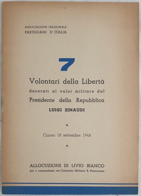 Pubblicazione edita dall'Associazione Nazionale Partigiani d'Italia su alcuni partigiani piemontesi decorati al valor militare dal Presidente della Repubblica Luigi Einaudi a Cuneo il 18 settembre 1948. Firma al contropiatto anteriore. In ottime condizioni. Copertina editoriale in ottime condizioni generali con lievi usure ai margini e dorso. Legatura in buone condizioni. Pagine in buone condizioni. In 8. Dim. 21x15 cm. Pp. 15+(1). Pamphlet edited by Associazione Nazionale Partigiani d'Italia about some partesans from Piedmont decorated to military value by the President of the Republic Luigi Einaudi in Cuneo the 18th of september 1948. Signature in the front counterplate. In very good conditions. Editorial cover in very good general conditions lightly worn in the extremities. Binding in good conditions. Pages are in good conditions. In 8. Dim. 21x15 cm. Pp. 15+(1).