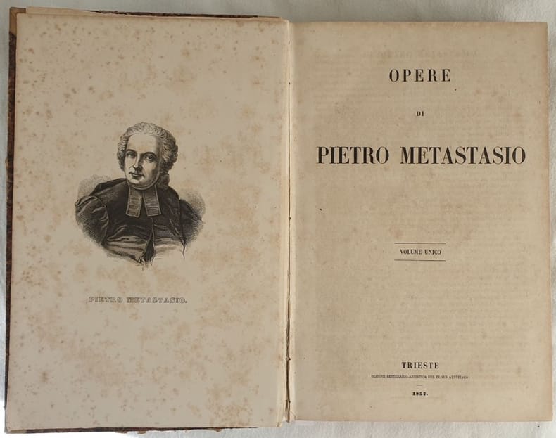 Edizione del 1857 di questa raccolta di opere di Pietro Metastasio (1698-1782). Introduzione su Metastasio e i suoi scritti a cura di A. Racheli. Seguono le seguenti opere: Giustino, Didone Abbandonata, L'impresario delle Canarie, Siface, Siroe, Catone in Utica, Ezio, Semiramide, Alessandro nell'Indie, Artaserse, Adriano in Siria, Demetrio, Issipile, Olimpiade, Demofoonte, La clemenza di Tito, Achille in Sciro, Ciro riconosciuto, Temistocle, Zenobia, Attilio Regolo, Antigono, Ipermestra, Il Re Pastore, L'Eroe cinese, Nitteti, Il trionfo di Clelia, Romolo ed Ersilia, Il Ruggiero ovvero l'eroica gratitudine, Per la festività del Natale, La passione di Gesu Cristo, Sant'Elena al calvario, La morte d'Abele, Giuseppe riconosciuto, Betulia liberata, Gioas Re di Giuda, Isacco figura del rEdentore, Casntate varie, Azioni e feste teatrali (La Galatea, L'Endimione, Gli orti esperidi, L'Angelica, La contesa de numi ecc...) Rime, Traduzioni, Osservazioni sul teatro greco, Lettere ecc... Ritratto di Metastasio in antiporta. Qualche nota manoscritta a matita. In buone condizioni e completo. Copertina in mezza pergamena coeva con decorazioni in oro al dorso in buone condizioni generali con usure ai margini e dorso. Legatura in buone condizioni ma antiporta staccata. Pagine in buone condizioni con fioriture. In 4. Dim. 28x19 cm. Pp. 1114. Peso Kg. 1,700. Edition of 1857 of this collection of works by Pietro Metastasio (1698-1782). Introduction about Metastasio and his writings by A. Racheli. Inside the following works: Giustino, Didone Abbandonata, L'impresario delle Canarie, Siface, Siroe, Catone in Utica, Ezio, Semiramide, Alessandro nell'Indie, Artaserse, Adriano in Siria, Demetrio, Issipile, Olimpiade, Demofoonte, La clemenza di Tito, Achille in Sciro, Ciro riconosciuto, Temistocle, Zenobia, Attilio Regolo, Antigono, Ipermestra, Il Re Pastore, L'Eroe cinese, Nitteti, Il trionfo di Clelia, Romolo ed Ersilia, Il Ruggiero ovvero l'eroica gratitudine, Per la festività del Natale, La passione di Gesu Cristo, Sant'Elena al calvario, La morte d'Abele, Giuseppe riconosciuto, Betulia liberata, Gioas Re di Giuda, Isacco figura del Redentore, Casntate varie, Azioni e feste teatrali (La Galatea, L'Endimione, Gli orti esperidi, L'Angelica, La contesa de numi ecc...) Rhymes, Translations, Observation about greek theatre, Letters ecc... Portrait of Metastasio in frontspice. Some handwritten notes with pencil. In good conditions and complete. Half parchment coeval cover with gilted decorations in the spine in good general conditions lightly worn in the extremities. Binding in good conditions but frontspice is detached. Pages are in good conditions with foxings. In 4. Dim. 28x19 cm. Pp. 1114. Weight Kg