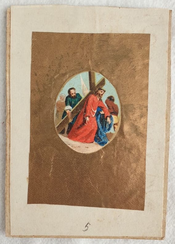 Incisione ottocentesca che mostra una stazione della Via Crucis. Litografia a colori applicata su foglia oro a sua volta applicata su cartoncino. In ottime condizioni. In 24. Dim. cm 10x7.Engraving of XIX century featuring a station of Via Crucis. Coloured lythography applied on golden leaf applied on carton base. In very good conditions. In 24. Dim. cm 10x7.