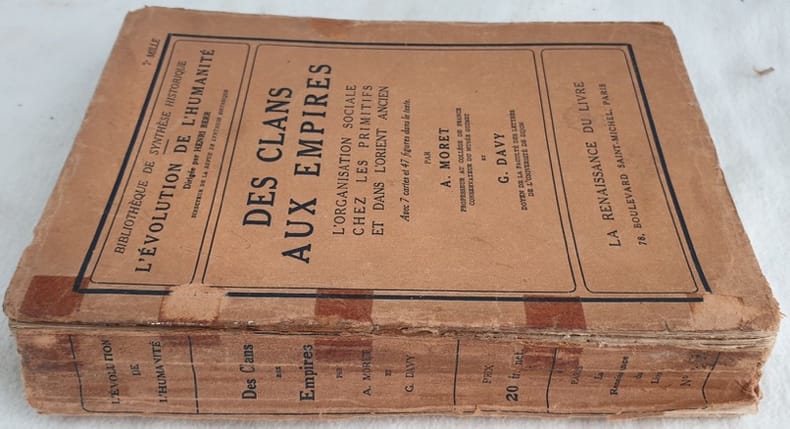 Edizione del 1923 di questa monografia dell'organizzazione sociale nei popoli primitivi e nell'Antico Oriente scritto da Moret e Davy della collana "L'evolution de l'humanite". All'interno: Organizzazione totemica, Origine della vita sociale e istituzioni politiche in Egitto, Regime egiziano e suoi vicini sotto l'Antico Impero, Mondo semitico fino all'anno 2000, invasioni iraniani e asiatiche e l'Impero Barbaro degli Hyksos, Impero egiziano, Egiziano ittita e popoli del Nord ecc... Note manoscritte a matita. In discrete condizioni. Copertina editoriale in discrete condizioni generali con usure ai margini e dorso. Segni di nastro adesivo al piatto anteriore e piatto posteriore mancante. Legatura in discrete condizioni con rotture. Pagine in ottime condizioni con rare fioriture. In 8. Dim. 20,5x14,5 cm. Pp. XXVIII+430+(2)Edition of 1923 of this monography about the social organisation in pre-historian people and Antique Middle East written by Moret and Davy of the serries "L'evolution de l'humanite". In fair conditions. Editorial cover in fair general conditions lightly worn in the extremities. Signs of adhesive tape in the front plate and back plate lacking. Binding in fair conditions. Inside pages are in very good conditions with occasional foxing. In 8. Dim. 20,5x14,5 cm. Pp. XXVIII+430+(2)