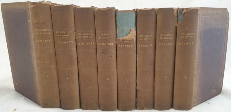 Edizione senza data ma dei primi del novecento della celebre opera autobiografica di Giacomo Casanova (1725-1798) alchimista, esoterista, diplomatico, scienziato filosofo. Casanova nell'opera, scritta volutamente in francese perchè avesse la massima diffusione possibile, descrive con franchezza le sue avventure e i suoi innumerevoli incontro galanti. L'opera è composta da otto tomi ed è completa. In buone condizioni. Copertina in tela con titolo in oro al dorso in discrete condizioni con usure e mancanze ai margini e dorso. Legatura in buone condizioni. All'interno le pagine si presentano in buone condizioni con fioriture. In 8. Dim. 19x13 cm. Pp. XVII+507, 530, 516, 533, 569+(3), 563, 567, 551. Peso Kg. 4,550.Edition not dated but of early 20th century of the famous autobiographycal work by Giacomo Casanova (1725-1798) alchemic, esoterist, diplomatic, scientist, phylosopher. Casanova in the work, written in french language by his decision to have the maximum spread, describes his adventures and lady conquer. The work is made up of eight tomes and it is complete. In good conditions. Cloth cover with golden title in the spine in fair conditions lightly worn in the extremities. Binding in good conditions. Inside pages are in good conditions with foxing. In 8. Dim. 19x13 cm. Pp. XVII+507, 530, 516, 533, 569+(3), 563, 567, 551. Weight Kg. 4,550.