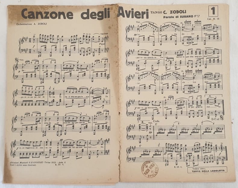 Partitura completa per orchestra del 1932 delle melodie di Zoboli "Canzone degli avieri" e "Tango della lodoletta". Copertina assente. GENERE: Tango STRUMENTI: pianoforte, violini; cello; contrabasso, tromba, trombone, sassofono, clarinetto, flauto, batteria ANNO: 1932 DIMENSIONI: In 8. cm 27,5x17,5 PAGINE: pp. 27. CONDIZIONI: Discrete condizioni. Ex libris.. Complete score for orchestra of 1932 of the melodies of Zoboli "Canzone degli avieri" and "Tango della lodoletta". Cover lacks. MUSIC: Tango STRUMENTI: piano, violin; cello; contrabbass, trumpet, trombone, saxophone, clarinet, flute, drums YEAR: 1932 SIZE: In 8. cm 27,5x17,5 PAGES: pp. 27 CONDITIONS: Fair conditions. Ex libris