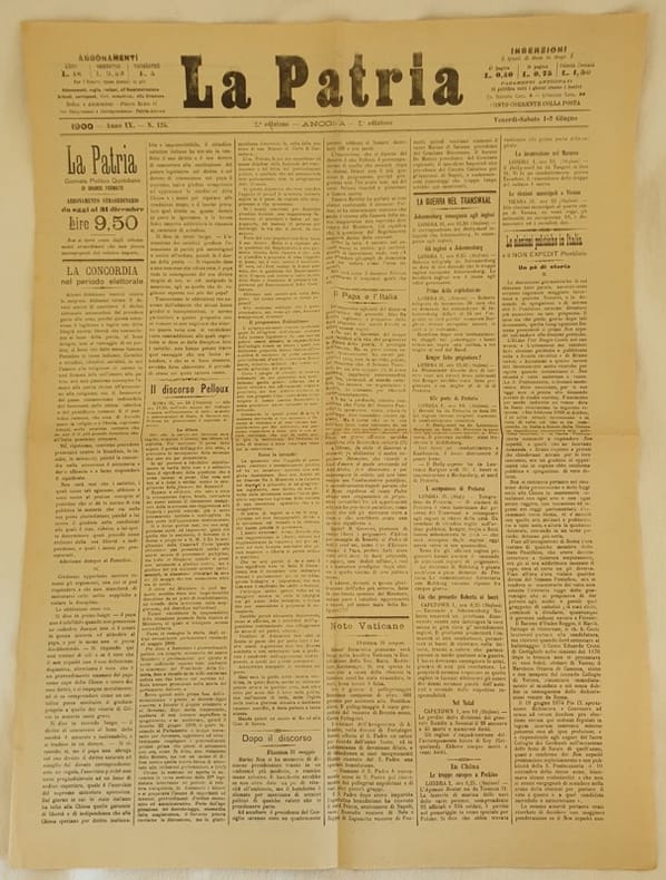 Numero del 1 e 2 giugno 1900 di questo raro quotidiano politico marchigiano. Tra gli articoli presenti: La concordia nel periodo elettorale, il discorso Pelloux, Guerra nel Transvaal, Elezioni politiche in Italia e il non expedit Pontificio, Amministrazione: a favore degli operai degli arsenali, Il processo per il disastro di Giovi, Dalle città: Brescia, Palermo, Viterbo, Varese, Roma, Asti, Como, Napoli, Ascoli Piceno, Camerino, Pausula, Ancon Dorica ecc.. In buone condizioni Raro. Brossura editoriale in buone condizioni generali con lievi usure e strappi ai margini e dorso. Piegature. Pagine si presentano in buone condizioni con rare fioriture. Piegature. In folio. Dim. 58x43 cm. Pp. (4). Number of the 1st and 2nd of june 1900 of this scarce daily political magazine from Marche region. Between the articles inside: Good behaviour in electoral period, Speech Pelloux, War in Transvaal, Political elections in Italy and non expedit Pontificio, Administration: in favour of workers of arsenal, Il processo per il disastro di Giovi, Dalle città: Brescia, Palermo, Viterbo, Varese, Roma, Asti, Como, Napoli, Ascoli Piceno, Camerino, Pausula, Ancon Dorica etc.. In good conditions Scarce copy. Editorial cover in good general conditions slightly worn in the edges and spine. Foldings. Inside pages are in good conditions with occasional foxings. Foldings.In folio. Dim. 58x43 cm. Pp. (4).