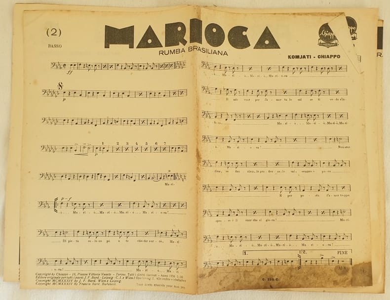 Partitura completa per orchestra del 1934 di due melodie "Marioca" di Komjati Chiappo e "Fior di loto" di Papanti Fiorita e Chiappo. Copertina assente. GENERE: Rumba brasiliana - Rumba fox trot STRUMENTI: violini; tromba; sassofono, batteria, contrabbasso ANNO: 1934 DIMENSIONI: In 8. cm 27,5x17,5 PAGINE: pp.32 CONDIZIONI: Buone condizioni. Copertina assente. Ex libris sulle pagine. Beautiful score of two songs of 1934, a complete score for orchestra of the melodies "Marioca" by Komjati Chiappo and "Fior di loto" by Papanti Fiorita and Chiappo MUSIC: Rumba brasiliana - Rumba fox trot STRUMENTI: violins; trumpet, saxophone, drums, contrabbass<BR>YEAR: 1934 SIZE: In 8. cm 27,5x17,5. PAGES: pp. 32 CONDITIONS: Good conditions. Cover lacks<BR>NOTES: Ex libris in the pages