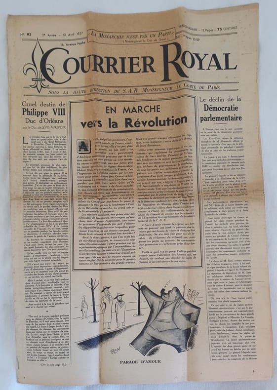 Numero del 10 aprile 1937 di questa celebre rivista quindicinale francese. Gli articoli: crudele destino di Filippo VIII d'Orleans, In marcia verso la rivoluzione, Declino della democrazia parlamentare, Armatura di ferro per liberare l'economia, Il Marocco francese a 25 anni, Fallimento dell'esperienza Roosevelt, Vita femminile: le bluse, Doloroso destino del Duca d'Orleans ecc... In buone condizioni Raro.Brossura editoriale in buone condizioni generali con lievi usure e strappi ai margini e dorso. Piegature. Pagine si presentano in buone condizioni con rare fioriture. Piegature. In folio. Dim. 50x35 cm. Pp. 12Number of the 10th of april 1937 of this famous french magazine. the articles: cruel destiny of Filippo VIII d'Orleans, In march towards revolution, Decline of parliament democracy, Iron army for freedom of democracy, French Morocco in 25 years, failure of Roosevelt experience, Female life: le bluse, Painful destiny of Duca d'Orleans ecc... In good conditions Scarce copy. Editorial cover in good general conditions slightly worn in the edges and spine. Foldings. Inside pages are in good conditions with occasional foxings. In folio. Dim. 50x35 cm. Pp. 12
