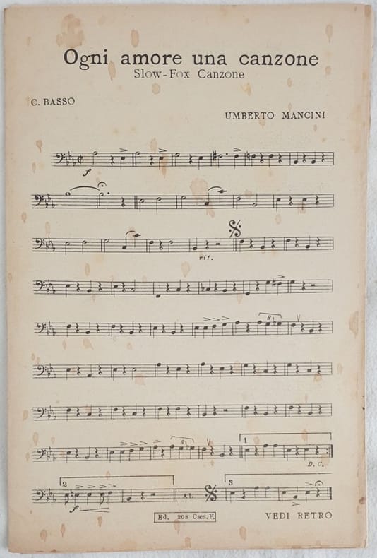 Partitura completa per orchestra degli anni '30 delle melodie di Umberto Mancini "Ogni amore una canzone" e "Moonlight Serenade".<BR>GENERE: Slow fox STRUMENTI: violini; violoncello, contrabasso, violoncello, sassofono, tromba, trombone, sassofono, banjo, batteria ANNO: anni '30 DIMENSIONI: In 8. cm 26,5x18<BR>PAGINE: pp. 26 CONDIZIONI: Buone condizioni. Copertina mancante. Complete score for orchestra of 1930's of the melodies of Umberto Mancini "Ogni amore una canzone" and "Moonlight Serenade".<BR>MUSIC: Slow fox STRUMENTI: violin; violoncello, contrabass, saxophone, trumpet, trombone, saxophone, banjo, drums YEAR: 1930's SIZE: In 8. cm 26,5x18 PAGES: pp. 26 CONDITIONS: Good conditions. cover lacks