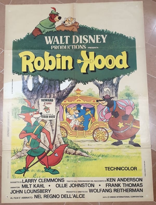 Originale poster da cinema del 1974 del cartone animato della Walt Disney "Robin Hood", l'anno in cui venne distribuito in Italia. Sul poster viene riportata la dicitura "Prima edizione italiana 1974". Il cartone venne trasmesso in quel cinema con il film "Nel regno dell'alce". In buone condizioni, qualche strappo alle piegature e nota manoscritta a penna al verso. Dimensioni: cm 140x100 cm. Original cinema poster of 1974 of the cartoons by Walt Disney "Robin Hood", the same year of distribution in Italy. In the poster the writing "First italian edition 1974". The cartoon was transmitted in that cinema with the movie "Nel regno dell'alce". In good conditions, some tear in the foldings and some manuscripted note with pen in the verso. Size: cm 140x100 cm