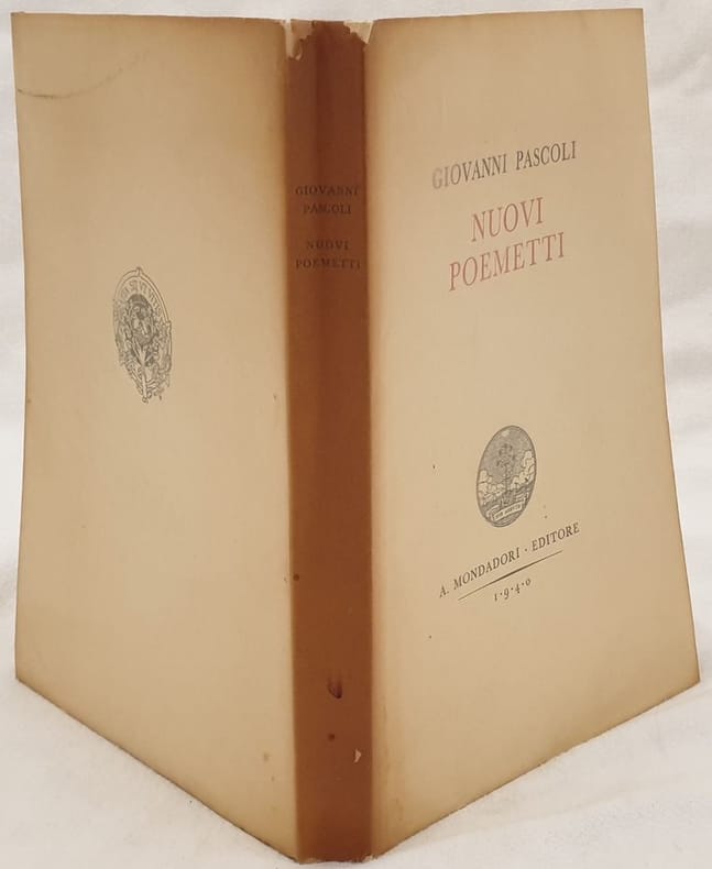 Edizione del 1940 di questa opera del poeta italiano Giovanni Pascoli (1885-1912) "Nuovi poemetti".<BR>La raccolta è dedicata a Maria Pascoli sorella del poeta, ed è espressamente presentata come un «invito alla campagna». Volume composto con caratteri Baskerville e curato nel testo da Maria Pascoli e Angelo Sodini impresso nell'aprile dell'anno MCMXXXI -IX nelle Officine Grafiche Veronesi. Su carta di Maslianico recante in filigrana la sigla pascoliana "Sub arbuto". Timbro a secco. In ottime condizioni. Intonso. Copertina editoriale con carta protettiva in buone condizioni generali con lievi usure ai margini e dorso. Legatura in buone condizioni. Pagine in ottime condizioni con rare fioriture. In 8. Dim. 23,5x16,5 cm. Pp. XIV+(4)+254+(4).Edition of 1940 of this work by the italian poet Giovanni Pascoli (1885-1912) "Nuovi poemetti". The colelction is dedicated to Maria Pascoli sister of the poet, and is expressely indicated as «invite to countryard». Volume made with carachters Baskerville and text cared by Maria Pascoli and Angelo Sodini written during april MCMXXXI -IX in Officine Grafiche Veronesi. On Maslianico paper with the mark of Pascoli "Sub arbuto". Embossed stamp. In very good conditions. Uncut copy Editorial cover with protective paper in good general conditions lightly worn in the extremities. Binding in good conditions. Inside pages are in very good conditions with occasional foxings. In 8. Dim. 24x17 cm. Pp. XIV+(4)+254+(4).