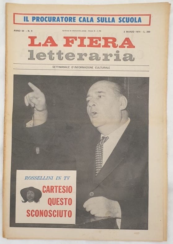 Numero del 3 marzo 1974 della "Fiera letteraria" rivista italiana di lettere scienze ed arti fondata nel 1925 e pubblicata con varie interruzioni fino al 1977. Tra gli articoli presenti: Il procuratore cala sulla scuola, Cartesio questo sconosciuto, Cartesio pedagogista, Processo a rappresaglia, Fantascienza italiana, Dalla parte del diavolo, Campo profughi, L'utopia non finisce, Vicari giornalista, Il silenzio di Bertoletti, Urbanistica italiana, Il giorno del delfino, Uno specchio che non da luce, Una rotta in fin di secolo ecc.. Foto e illustrazioni. In buone condizioni. Brossura editoriale in buone condizioni generali con lievi usure ai margini e dorso. Piegatura orizzontale. Pagine in ottime condizioni. In folio. Dim. 43x30 cm. Pp. 32.Number of 3rd of march 1974 of the italian magazine of letetrs science and arts established in 1925 and published with different interrumptions until 1977. the articles inside: Cartesio, Italian Phantascience, Vicari journalist, The silence of Bertoletti, Italian urbanistic, The day of dolphin ecc... In good conditions. Editorial cover in good general conditions lightly worn in the edges and spine with signs of labels. Foldings. Inside pages are in good conditions with foxing.In folio. Dim. 43x30 cm. Pp. 32.<BR><BR>