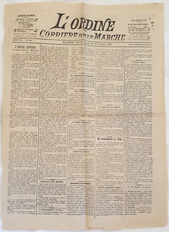 Numero del 28 29 giugno 1900 di questo raro quotidiano politico marchigiano. Il quotidiano venne fondato il 5 ottobre 1866 dal patriota risorgimentale e poeta ripano Luigi Mercantini. A partire dal 1926 assunse il nome di "Corriere Adriatico" tuttora esistente.<BR><BR>Tra gli articoli presenti: L'esercizio provvisorio il rifiuto dell'On. Mariotti, La sinistra costituzionale, Gli avvenimenti in Cina, Il treno aereo, Per l'erigendo ospedale ad Ancona, Liceo Rinaldini, Camera di commercio ed arti di Ancona, Guerra nel Sud Africa ecc... In buone condizioni Raro.Brossura editoriale in buone condizioni generali con lievi usure e strappi ai margini e dorso. Piegature. Pagine si presentano in buone condizioni con rare fioriture. Piegature. In folio. Dim. 58x43 cm. Pp. (4). Number of the 28th 29th of June 1900 of this scarce daily newspaper form Marche.<BR><BR>The newspaper was established the 5th of october 1866 byt he patriot and poet from Risorgimento period Luigi Mercantini. From 1926 it was renamed "Corriere Adriatico" and it is still existing. Between the articles inside: The refusal of On. Mariotti, Constitutional left party, happenings in China, air train, For the hospital builds in Ancona, Liceo Rinaldini, Camera di commercio ed arti in Ancona, War in South Africa etc.. In good conditions Scarce copy. Editorial cover in good general conditions slightly worn in the edges and spine. Foldings. Inside pages are in good conditions with occasional foxings. Foldings.In folio. Dim. 58x43 cm. Pp. (4).