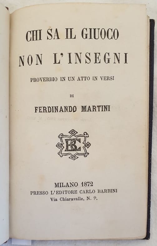 Raccolta di quattro opere legate assieme in un unico volume. La prima è l'edizione del 1872 della commedia "Chi sa il giuoco non l'insegni" dello scrittore e politic Ferdinando Martini (1841-1928). La seconda "Fuoco al convento". Senza data ma della fine del XIX secolo. La terza "Un dente all'epoca di Luigi XV" di Labiche e Lefranc. La quarta "Ludro e la sua gran giornata" del commediografo Francesco Augusto Bon (1788-1858). In buone condizioni. Copertina in mezza tela in buone condizioni generali con lievi usure ai margini e dorso. Legatura in buone condizioni. Pagine in buone condizioni con fioriture. In 16. Dim. 15,5x10 cm. Pp. 64+32+13+(3)+64. Collection of four works bound together in a unique volume.<BR><BR>The first one is the edition of 1872 of the play "Chi sa il giuoco non l'insegni" by the politician and writer Ferdinando Martini (1841-1928). The second one "Fuoco al convento". No date but of the end of 19th century. The third one "Un dente all'epoca di Luigi XV" by Labiche and Lefranc. The fourth one "Ludro e la sua gran giornata" by the playwriter Francesco Augusto Bon (1788-1858). In good conditions. Half cloth cover win good conditions lightly worn in the extremities. Binding in good condition. Pages in good conditions with foxing. In 16. Dim. 15,5x10 cm. Pp. 64+32+13+(3)+64.