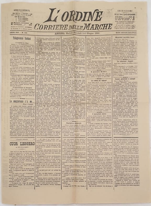 Numero del 5 6 giugno 1900 di questo raro quotidiano politico marchigiano. Il quotidiano venne fondato il 5 ottobre 1866 dal patriota risorgimentale e poeta ripano Luigi Mercantini. A partire dal 1926 assunse il nome di "Corriere Adriatico" tuttora esistente. Tra gli articoli presenti: Telegrammi Stefani, i conflitti in Cina, Cuor leggero di Boisgobey, Il Ministro Bettolo, Bissolati, I socialisti eletti, Gallo eletto a Foligno, All'oratorio israelitico, Arrestati di Offagna, Collegio di Montegiorgio, Il misfatto di Varano, Da Loreto, La cattedra ambulante di agricoltura per la provincia di Ancona ecc... In buone condizioni Raro. Brossura editoriale in buone condizioni generali con lievi usure e strappi ai margini e dorso. Piegature. Pagine si presentano in buone condizioni con rare fioriture. Piegature. In folio. Dim. 58x43 cm. Pp. (3) Number of the 5th 6th of june 1900 of this scarce daily newspaper form Marche. The newspaper was established the 5th of october 1866 byt he patriot and poet from Risorgimento period Luigi Mercantini. From 1926 it was renamed "Corriere Adriatico" and it is still existing. Between the articles inside: Telegrams Stefani, Conflicts in China, Cuor leggero by Boisgobey, The Ministery bettolo, Bissolati, Socialists elected, Gallo elected in Foligno, Jewish oratory, Arrested people in Offagna, Collegio of Montegiorgio, Varano, From Loreto In good condition Scarce copy. Editorial cover in good general conditions slightly worn in the edges and spine. Foldings. Inside pages are in good conditions with occasional foxings. Foldings. IIn folio. Dim. 58x43 cm. Pp. (3)