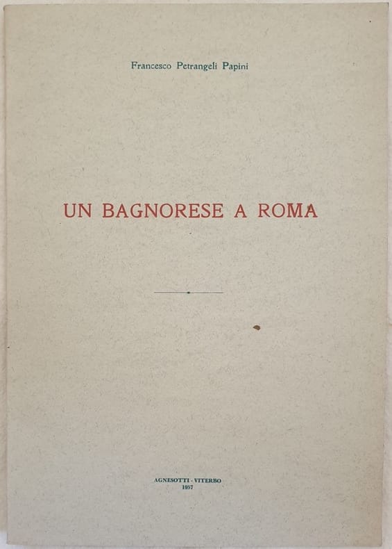 Interessante pubblicazione del 1957 su Bagnoregio di Francesco Petrangeli Papini. L'autore ricerca alcuni elementi del suo paese natio Bagnoregio a Roma: le pietre delle strade, personaggi illustri, Santi ecc... Estratto dal libro inedito "Il ramo sotto gli scrosci Diario strapaesano (Roma 1945-1947)." In ottime condizioni. Copertina editoriale in ottime condizioni generali con lievi usure marginali. Legatura in ottime condizioni. All'interno le pagine si presentano in ottime condizioni. In 8. Dim. 24x17 cm. Pp. 34+(2). interesting pamphlet of 1957 about Bagnoregio by Francesco Petrangeli Papini. The author looks for some elemnts of his town Bagnoregio in Rome: the stones of the streets, important people, Saints ecc... Extract from the inedit book "Il ramo sotto gli scrosci Diario strapaesano (Roma 1945-1947)." In very good conditions Editorial cover in very good general conditions lightly worn in the extremities. Binding in very good conditions. Inside pages are in very good conditions. In 8. Dim. 24x17 cm. Pp. 34+(2).