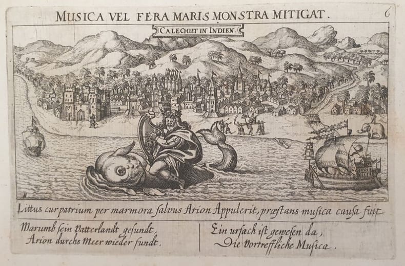 Bella veduta seicentesca della città di Calcutta in India tratta dall'opera Sciagraphia Cosmica nota anche con il titolo "Das ist Newes Emblematisches Buechlei, dainen in acht Centurijs die vornembste Stat, Vestung, Schlosser der ganzen Welt". Mostro marino cavalcato da un arpista e imbarcazioni. Motto "Musica vel fera maris monstra mitigat" La musica calma perfino i mostri marini. La Sciagraphia Cosmica, venne ampliata sotto la supervisione di Kieser dopo la morte di Meisner nel 1625, arrivando quindi ad una composizione di 800 magnifiche incisioni.Ogni opera è caratterizzata da un motto sopra l'immagine, e da versi emblematici (in latino o tedesco). L'opera è la combinazione di due generi allora popolari, il libro degli stemmi e il "Teatro delle città". Tra i maestri incisori e miniatori che contribuirono a questa serie ci sono Matthäus Merian, Sebastian Furck, Christian Stimmer e forse anche Meisner stesso, che concepì l'opera e contribuì a buona parte della prosa. (Cfr. Cremonini pag. 54/58, 45a). In buone condizioni Data: XVII secolo Tecnica: acquaforte Dimensione del foglio: 16x20 cm Dimensione incisione: 10x15 cm Condizioni: Buone. Alcune fioriture. Beautiful view of 17th century of Kolkata city in India from the work Sciagraphia Cosmica also known with the title of "Das ist Newes Emblematisches Buechlei, dainen in acht Centurijs die vornembste Stat, Vestung, Schlosser der ganzen Welt". Sea Monster with an arpist and boats. Saying "Musica vel fera maris monstra mitigat" Music relaxes even sea monsters.The Sciagraphia Cosmica, was enlarged under the vision of Kieser after the death of Meisner in 1625, getitng to a composition of 800 very beautiful views.Each work has acarchterized by a saying above the engraving, and of verses in latin and german. Between the engravers and illustrator there are Matthäus Merian, Sebastian Furck, Christian Stimmer and perhaps also Meisner who created the work and contrinbuited to a part of the prose. (Cfr. Cremonini pag. 54/58, 45a). In good conditions Date: 17th century Technique: Etching Leaf Dimension: 16x20 cm Engraving Dimension: 10x15 cm Conditions: Good conditions. Some foxing.