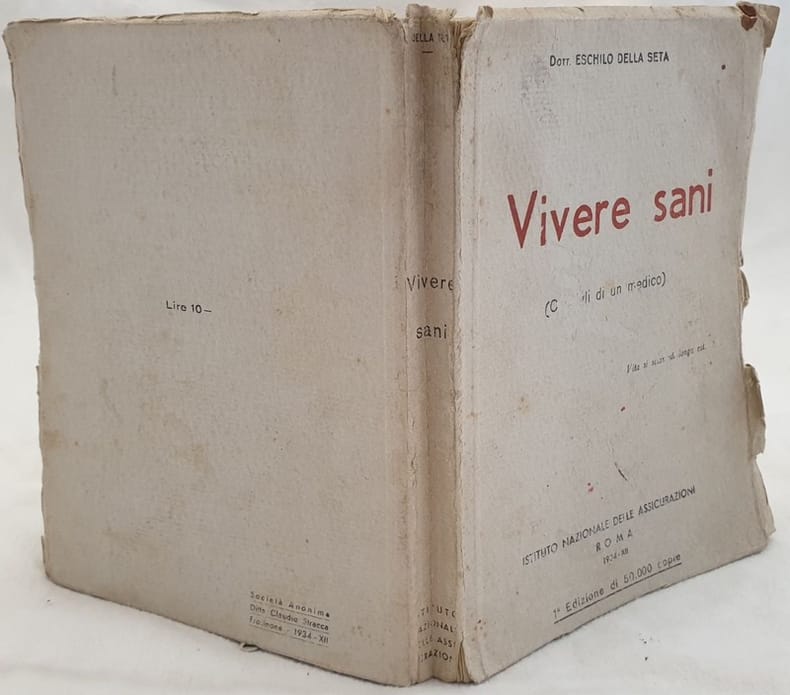 Edizione del 1934 di questo volume di medicina domestica del Dott. Eschilo della Seta edito dall'Istituto Nazionale delle Assicurazioni. All'interno: Igiene preventiva, Per mantenersi giovani e sani (l'igiene non è un sacrificio, igiene preventiva, aspetto esteriore, una buona dentatura, il peso del corpo e la durata della vita, igiene del vestiario), L'igiene nella vita e nel lavoro (Cultura fisica e sports, vacanze), Bacco tabacco e venere (Si puo bere il vino, Cocktails birra caffe e te, il fumo, le sostanze stupefacenti, Igiene della vita sessuale), Medicina preventiva (Sorvegliatre il vostro cuore per prevenirne le malattie, tumori maligni, tubercolosi, malattie del ricambio e apparato urinario, Altri malanni , segnali di allarme, La salute della donna ecc... Alla fine appendice: provvidenze sanitarie a favore degli assicurati. In buone condizioni. Copertina editoriale in discrete condizioni generali con usure e mancanze marginali. Legatura in discrete condizioni con lievi rotture. Pagine in buone condizioni con rare fioriture. In 8. cm 21,5x16,5. Pp. 303+(1) Edition of 1934 of this volume of home medicine by Dott. Eschilo della Seta edited by Istituto Nazionale delle Assicurazioni. Inside: preventive hygiene, to maintain young and healthy Cleaning in life and work Tobacco and wine Cocktails, beer coffee and tea, drugs), Preventive medicine, deseases of women ecc... Appendix at the end: health insurance in favour of insured people. In good conditions. Editorial cover in fair conditions lightly worn in the extremities. Binding in fair condition with light cracks. Pages in good conditions with occasional foxing. In 8. cm 21,5x16,5. Pp. 303+(1)<BR><BR>