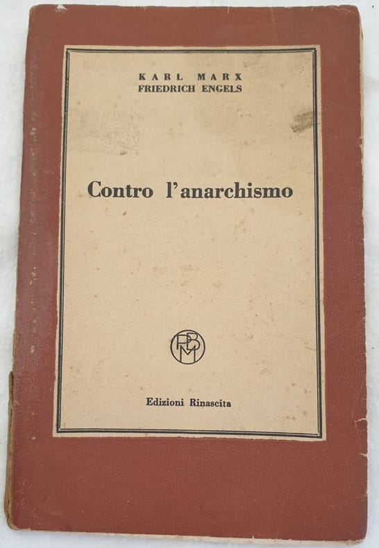 Edizione del 1950 di questa monografia di Karl Marx e Friedrich Engels contro l'anarchismo. All'interno: L'indifferenza in materia politica, I bakunisti al lavoro, Dell'autorita, Dagli appunti di Karl Marx sul libro di Bakunin, MArx a Bolte, Engels a Cuno, Dalle risoluzioni della Conferenza di Lodra, Degli statuti generali approvati al Congresso dell'Aja ecc... Alla fine cenni biografici sui personaggi più importanti citati nel volume. In discrete condizioni. Copertina editoriale in discrete condizioni generali con usure marginali. Piatto posteriore in parte staccato. LeEdition of 1950 of this monography by Karl Marx and Friedrich Engels against anarchism. Att he end biographycal information about the most important carachtersv cited in the volume. In good conditions.Editorial cover in fair conditions lightly worn in the extremities. Back plate is almost detached. Binding in good general conditions. Inside pages are in good conditions. In 8. cm 19x12,5. Pp. 69+(3). gatura in buone condizioni. Pagine in buone condizioni generali. In 8. cm 19x12,5. Pp. 69+(3).