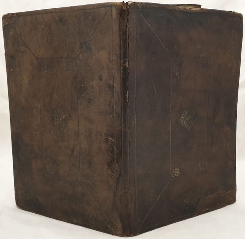 Olomucii (Olmuncia, Olmütz), typis Joannis Josephi Kylian, 1693, gr. in-4to, text on 2 col., 42 pp. (last page non numb.), incl. title with large wood-engraved vignette (two angels showing the light to people in hell crying for mercy) and one full page copper engraving (the Crucifiction scene; Scamuzer fecit Viennae), text, music, (partly ornamental floral) initials and ornam. end pieces in red and/or black, pages with simple and double line frames, marginal finger- and water-staining, binding loosening, title and two other leaves partly loose,false folds to a few leaves and corners, small tear to both endpaper leaves, rear pastedown stained, part of edge of both pastedowns scraped off, entirely blindstamped black leather binding, stained, rubbed and with some worming mainly to edges, to corners and to top of spine.
