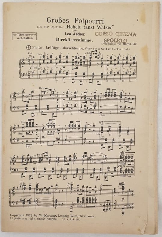 Partitura per orchestra del 1913 della melodia "Grosses potpourri" di Leo Ascher. Copertina assente. STRUMENTI: pianoforte, violini ANNO: 1913 DIMENSIONI: In 8. cm 26x16,5 PAGINE: pp. 27 CONDIZIONI: Buone condizioni. Ex libris. Complete score for orchestra of 1913 of the melody "Grosses potpourri" by Leo Ascher. Cover lacks. STRUMENTI: piano, violins YEAR: 1913 SIZE: In 8. cm 26x16,5 PAGES: pp. 27 CONDITIONS: Good conditions. Ex libris