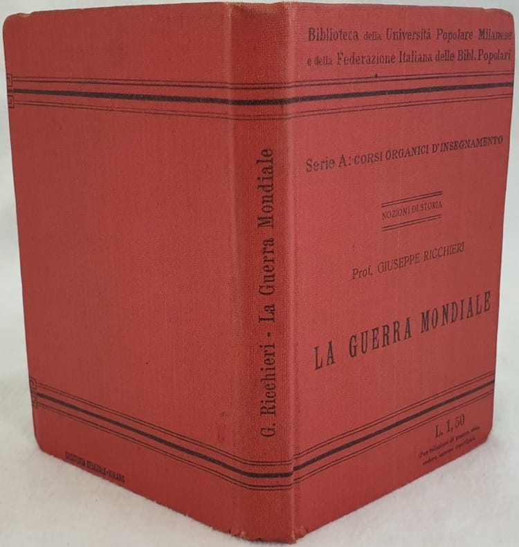 Edizione del 1915 di questa monografia sulla guerra mondiale del Prof. Giuseppe Ricchieri.<BR><BR>All'inizio mappa a colori ripiegata dell'Europa politica e Stati e possedimenti.<BR><BR>Alcune mappe e foto in bianco e nero.<BR><BR>All'interno: ampiezza e cause fondamentali dell'attuale configurazione, Caratteristiche dell'espansione coloniale della SPagna e del Portogallo, Olanda, Gran Bretagna e Francia, Russia e Stati Scandinavi, Turchia, La Germania sua eespansione commerciale e coloniale, Belgio, Sttai Uniti e Giappone, Il principio di nazionalità, Le principali questioni nazionali della guerra attuale, L'Italia di fronte alla guerra attuale ecc...<BR><BR>In buone condizioni.<BR><BR>Coperta editoriale in buone condizioni generali con lievi usure ai margini e dorso. Legatura in buone condizioni. Pagine in buone condizioni con rare fioriture. In 16. Dim. 16x11,5 cm. Pp. 177+XI+(2). Edition of 1915 of this monography about the world war by Prof. Giuseppe Ricchieri. At the beginning folded coloured map of politic Europe and States and colonies. Some maps and black and white photos. In good conditions. Editorial cover in good conditions lightly worn in the extremities. Binding in good conditions. Pages in good conditions with occasional foxings. In 16. Dim. 16x11,5 cm. Pp. 177+XI+(2).