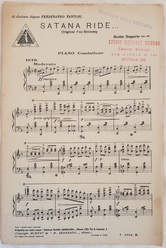 Partitura per orchestra del 1925 della melodia dall'op. 18 di Guido Sagaria "Satana ride". <BR>Copertina assente. GENERE: Fox shimmy STRUMENTI: pianoforte, violino, violoncello, clarinetto, flauto, tromba, trombone, contrabasso, batteria ANNO: 1925 DIMENSIONI: In 8. cm 27x18 PAGINE: pp. 12 CONDIZIONI: Discrete condizioni. Ex libris in copertina. Complete score for orchestra of 1921 of the melodies of Robert Stolz "Kakadu". Arrangement by Martin Uhl. Cover lacks. MUSIC: One step STRUMENTI: piano, violin violoncello, contrabbass, trumpet, trombone, clarion, flute, drums<BR>YEAR: 1925 SIZE: In 8. cm 27x18 PAGES: pp.12 CONDITIONS: Fair conditions. Ex libris in the cover