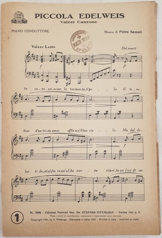 Partitura per orchestra del 1931 della melodia di Pietro Sassoli "Piccola Edelweis", "Vola va...canzone!" di Felice Lattuada. Copertina assente. GENERE: Valzer STRUMENTI: pianoforte, violino, clarinetto, flauto, tromba, contrabasso<BR>ANNO: 1931 DIMENSIONI: In 8. cm 26,5x17,5<BR>PAGINE: pp. 16 CONDIZIONI: Discrete condizioni. Ex libris in copertinaComplete score for orchestra of 1931 of the melodies of Pietro Sassoli "Piccola Edelweis", "Vola va...canzone!" by Felice Lattuada Cover lacks. MUSIC: Waltz STRUMENTI: piano, violin violoncello, clarion, flute, trumpet, contrabass<BR>YEAR: 1931 SIZE: In 8. cm 26,5x17,5 PAGES: pp.16 CONDITIONS: Fair conditions. Ex libris in the cover