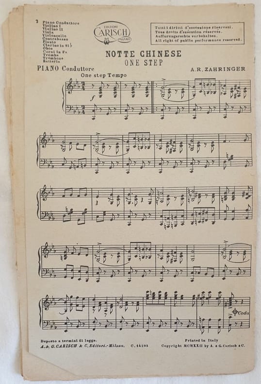 Partitura per orchestra del 1922 della melodia "Notte Chinese" di A. R. Zahringer. Copertina assente. STRUMENTI: pianoforte, violini, violoncello, contrabasso, tromba, trombone, clarino, flauto, batteria ANNO: 1922 DIMENSIONI: In 8. cm 27x17,5 PAGINE: pp. 10 CONDIZIONI: Buone condizioni. Ex libris. Complete score for orchestra of 1922 of the melody "Notte Chinese" by A. R. Zahringer. Cover lacks. STRUMENTI: piano, violins, violoncello, contrabass, trumpet, trombone, clarion, flute, drums YEAR: 1922 SIZE: In 8. cm 27x17,5 PAGES: pp. 10 CONDITIONS: Good conditions. Ex libris