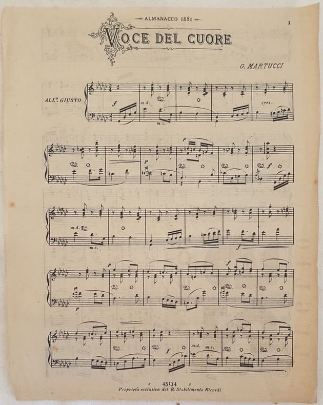 Partitura per pianoforte del 1881 della melodia "Voce del cuore" di G. Martucci. Copertina assente. ANNO: 1881 DIMENSIONI: In 8. cm 25x17,5 PAGINE: pp. (2) CONDIZIONI: Buone condizioni. Score for piano of 1881 of the melody "Voce del cuore" by G. Martucci. Cover lacks. YEAR: 1881 SIZE: In 8. cm 25x17,5 PAGES: pp. (2) CONDITIONS: Good conditions.