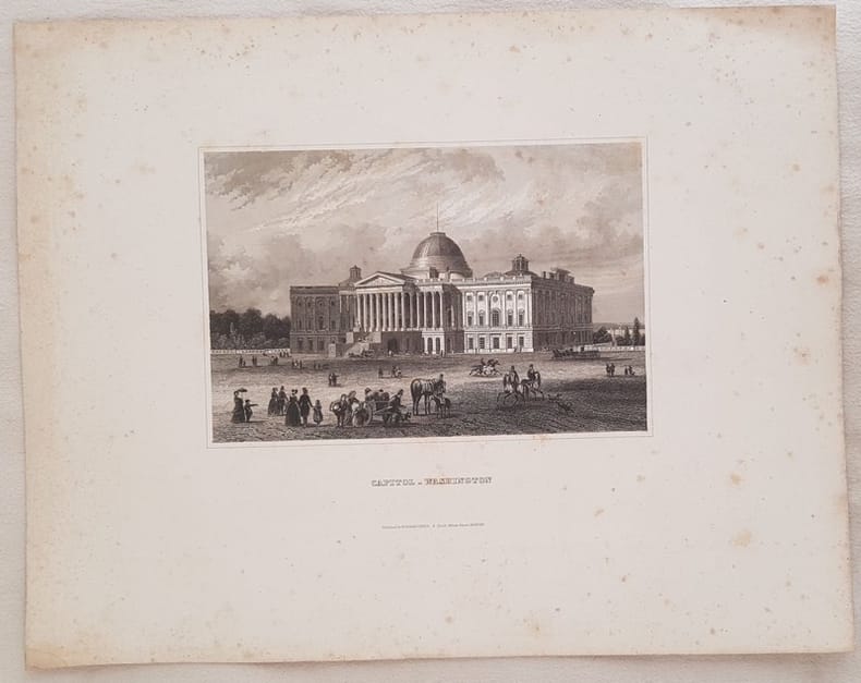 Veduta del Capitol a Washington del 1860 circa.<BR>Date: 1860 circa<BR>Atlante: Meyer s Universum 1838-1860 circa<BR>Tecnica: incisione su acciaio Dimensione del foglio: 24x30,5 cm <BR>Dimensione dell'incisione: 11,5x17 cm Condizioni: Buone. Alcune fioritureBeautiful view of United States Capitol or Capitol Building in Washington of 1860 circa. Date: 1860 circa Atlas: Meyer s Universum 1838-1860 circa<BR>Technique: Steel etching Leaf Dimension: 24x30,5 cm (9.4x12 inches) Engraving Dimension: 11,5x17 cm (4.5x6.7 inches) Conditions: Good conditions. Some foxings