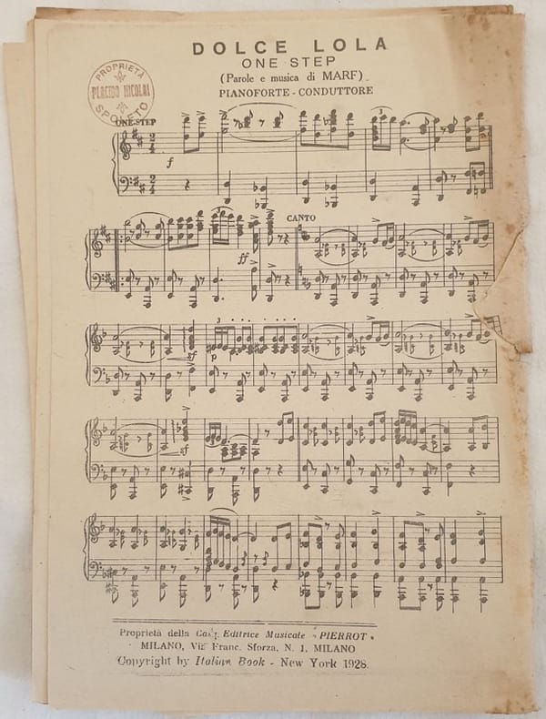 Partitura per orchestra del 1928 della melodia "Dolce Lola" di Marf. Copertina assente. GENERE: One step STRUMENTI: pianoforte, violini, violoncello, contrabbasso, tromba, trombone, flauto, clarinetto, batteria ANNO: 1928 DIMENSIONI: In 8. cm 25,5x18 PAGINE: pp. 11 CONDIZIONI: Buone condizioni. Strappo in copertina. Fioriture. Ex libris.Beautiful score of two songs of 1928, a score for orchestra of the melody Dolce Lola" by Marf Cover lacks MUSIC: One step STRUMENTI: piano, violins, violoncello, contrabass, trumpet, trombone, flute, clarinet, drums<BR>YEAR: 1928 SIZE: In 8. cm 25,5x18 PAGES: pp. 11 CONDITIONS: Good conditions. Foxing. Ex libris. Tear in the cover