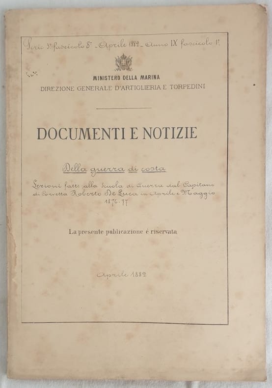 Rara raccolta di appunti editi dal Ministero della Marina sulla guerra di costa. Lezioni fatte alla Scuola di guerra dal capitano di Corvetta Roberto De Luca nell'Aprile maggio 1876-77. Questa copia litografata di appunti manoscritti era parte dellle manualistica che ogni ufficiale della Marina doveva avere e faceva parte dell'archivio di ogni nave. Ogni copia riporta la firma del proprietario che lo aveva in carico. All'interno: Il materiale navale, Fortificazioni da costa, Delle ostruzioni, Torpedini, navi speciali per difesa locale, Impiego dei mezzi di attacco e difesa nelle diverse operazioni, Trasporto delle truppe, Imbarco traversata ed ancoraggio della spedizione, Sbarco della spedizione, Dei bombardamenti marittimi, Assedi marittimi: stretti difesi ecc... Il contenuto era riservato ai componenti della Marina e al Governo. Alcune illustrazioni e tabelle ripiegate. In buone condizioni. Copertina editoriale in buone condizioni generali con lievi usure ai margini e dorso. Gore marginali. Legatura in buone condizioni. Pagine in buone condizioni con fioriture. In folio. cm 35x24,5. Pp. (4)+167.Scarce collection of notes edited by Ministero della Marina about War of Coast. Lezioni fatte alla Scuola di guerra dal capitano di Corvetta Roberto De Luca nell'Aprile maggio 1876-77. This lythographed copy of handwritten notes was part of the manuals each officier of Marinee should have and belonged to the archive of the ship and was considered reserved. Each copy has the signature of the owner. Some illustrations and folded plates. In good conditions. Editorial cover in good conditions lightly worn in the extremities. Dump stains in the extremities. Binding in good conditions. Pages in good conditions with foxing. In folio. cm 35x24,5. Pp. (4)+167.