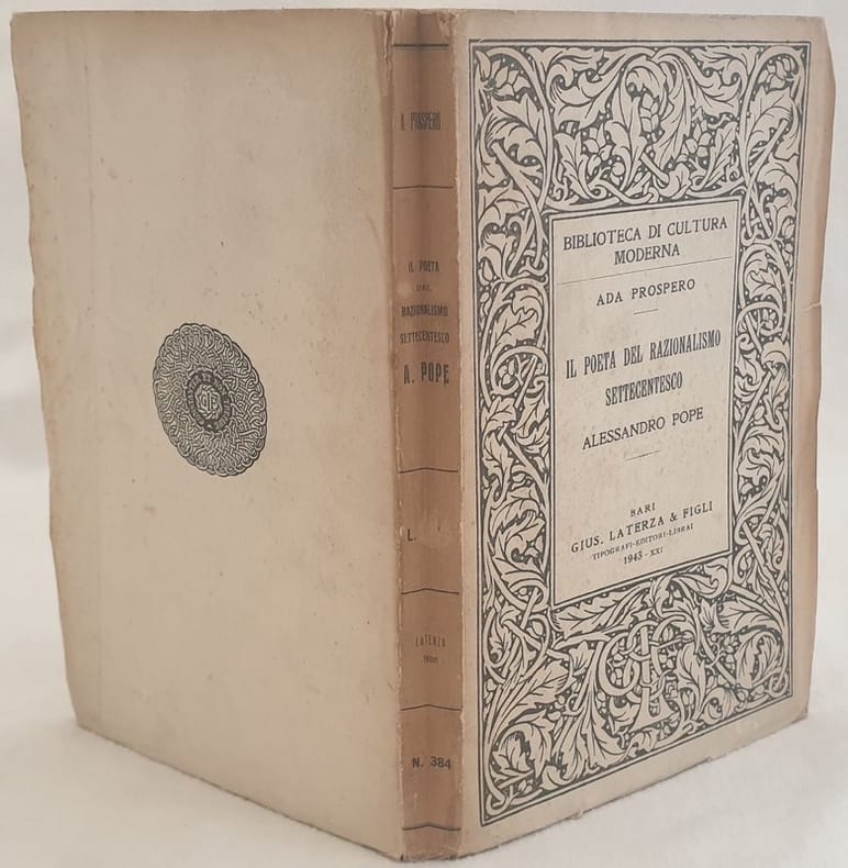 Edizione del 1943 di questa monografia sul poeta del razionalismo settecentesco Alexander Pope (1688-1744) a cura di Ada Prospero. Volume della collana "Biblioteca di cultura moderna". All'interno: istinti romantici e disciplina classica, il credo letterario, il volo poetico, la battaglia, il credo etico, l'umanità della satira ecc... In buone condizioni. Copertina editoriale in buone condizioni generali con lievi usure ai margini e dorso. Legatura in buone condizioni. Pagine in buone condizioni con fioriture. In 8. cm 20,5x13,5. Pp. 186+(2).Edition of 1943 of this monography about the poet Alexander Pope (1688-1744) by Ada Prospero. Volume of the series "Biblioteca di cultura moderna". In good conditions Editorial cover in good conditions lightly worn in the extremities. Binding in good conditions. Pages in good conditions with foxing. In 8. cm 20,5x13,5. Pp. 186+(2).