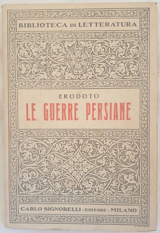 Edizione Signorelli della collana "Biblioteca di letteratura" dell'opera classica "Le guerre persiane" di Erodoto. Passi scelti e annotati da G. Calzavara. L'opera è completa. Graziose brossure con decorazioni. In buone condizioni. Copertina editoriale in buone condizioni con lievi usure ai margini e dorso. Legatura in buone condizioni. All'interno le pagine si presentano in buone condizioni con fioriture. In 16. Dim. 15x10,5 cm. Pp.104+(2) Signorelli edition of the series "Biblioteca di letteratura" of the classic work "Le guerre persiane" by Erodoto. Chosen pieces with notes by G. Calzavara.Nice decorations on the covers. In good conditions. Editorial cover in good conditions slightly worn in the edges and spine (see the photo). Binding in good conditions. Inside pages are in good conditions with foxings. In 16. Dim. 15x10,5 cm. Pp.104+(2)