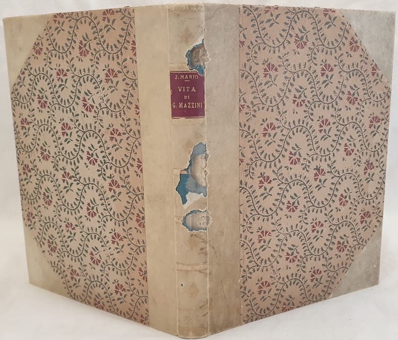 Edizione del 1908 di questo volume sulla vita del patriota Giuseppe Mazzini (1805-1872) scritto da Jessie W. Mario. Numerose illustrazioni nel testo e a piena pagina qualcuna incisa da Barberis su disegno di Mantegazza. Dedica in lingua inglese datata 1913 al verso del ritratto di Mazzini e firma al frontespizio.Insieme al volume parte di nastro tricolore. In buone condizioni. Copertina in mezza pergamena con titolo in oro su tassello al dorso in discrete condizioni generali con usure e parti mancanti ai margini e dorso. Legatura in buone condizioni. All'interno le pagine si presentano in buone condizioni con fioriture. In 4. Dim. 31x24 cm. Pp. XII+499+(1).Edition of 1908 of this volume about the life of the patriot Giuseppe Mazzini (1805-1872) written by Jessie W. Mario. Different full page and in the text engravings some engraved by Barberis on drawing by Mantegazza. Dedication in english language dated 1913 in the verso of portrait of Mazzini and signature in the title page. Tigetehr with the volume part of three coloured band. In good conditions.Half parchment cover with gilted spine title label in the spine in fair general conditions lightly worn in the extremities. Binding in good conditions. Inside pages are in good conditions with foxing. In 4. Dim. 31x24 cm. Pp. XII+499+(1).