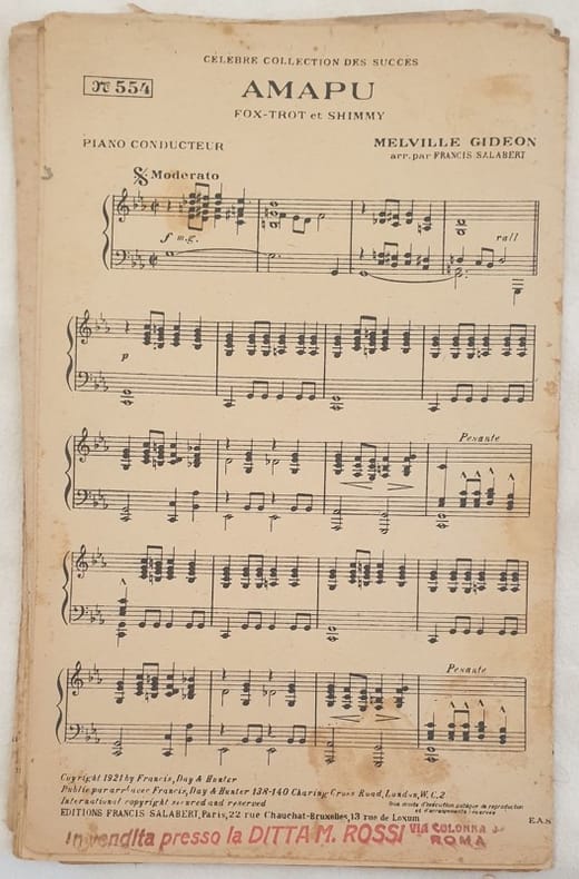 Partitura per orchestra del 1921 della melodia "Amapu" di Melville Gideon<BR>Copertina assente. GENERE: STRUMENTI: pianoforte, violini; violoncello, flauto, trombone, clarinetto, corni, alto hautbois, batteria<BR>ANNO: 1921 DIMENSIONI: In 8. cm 27,5x17,5<BR>PAGINE: pp. 16 CONDIZIONI: Discrete condizioni. Fioriture Score for orchestra of 1921 of the melody "Amapu" by Melville Gideon Editorial soft cover. MUSIC: Tango STRUMENTI: piano, violin; violoncello, flute, trombone, clarinet, horns, high, hautbois, drums YEAR: 1921 SIZE: In 8. cm 27,5x17,5<BR>PAGES: pp. 16 CONDITIONS: Fair conditions. Foxing