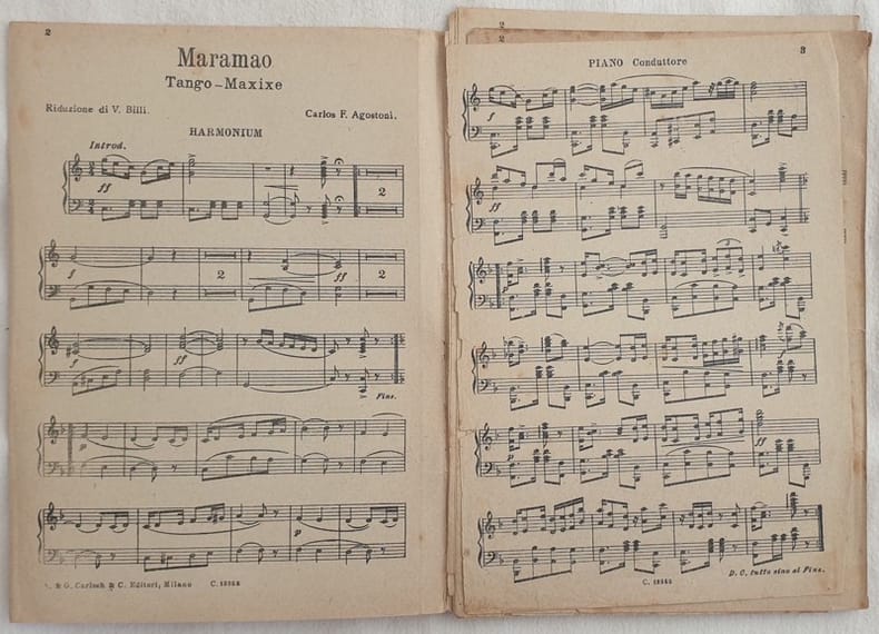 Partitura per orchestra degli anni 30 della melodia "Maramao" di Carlos F. Agostoni. Riduzione di V. Billi Copertina assente. GENERE: Tango STRUMENTI: pianoforte, harmonium, violini, violoncello, viola, flauto, clarinetto, corni, contrabbasso, tromba, trombone, oboe, batteria ANNO: anni '30 DIMENSIONI: In 4. cm 25,5x18,5 PAGINE: pp. 21 CONDIZIONI: Buone condizioni. Fioriture. Ex libris.Beautiful score of 1930's, a score for orchestra of the melody "Maramao" by Carlos F. Agostoni. Reduction by V. Billi Cover lacks MUSIC: Tango STRUMENTI: piano, harmonium, violins, violoncello, contrabass, trumpet, viola, flute, clarinet, horns, trombone, oboe, drums YEAR: 1928 SIZE: In 4. cm 25,5x18,5 PAGES: pp. 21 CONDITIONS: Good conditions. Foxing. Ex libris