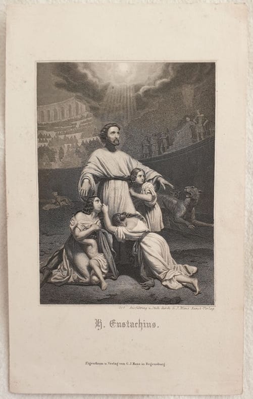 Incisione del 1870 circa di Sant'Eustachio Martire. Autore: G. J. Manz Kunst Verlag Titolo: S. Eustachius Data: 1870 circa Tecnica: incisione su acciaio Dimensione del foglio: 18,5x11 cm Dimensione incisione: 11,5x8,5 cm Condizioni: Buone. Alcune fioriture. Engraving of 1870 circa of Saint Eustachio Martyr. Author: G. J. Manz Kunst Verlag Title: S. Eustachius Date: 1870 circa Technique: steel etching engraving Leaf Dimension: 18,5x11 cm Engraving Dimension: 11,5x8,5 cm Conditions: Good conditions. Some foxing.