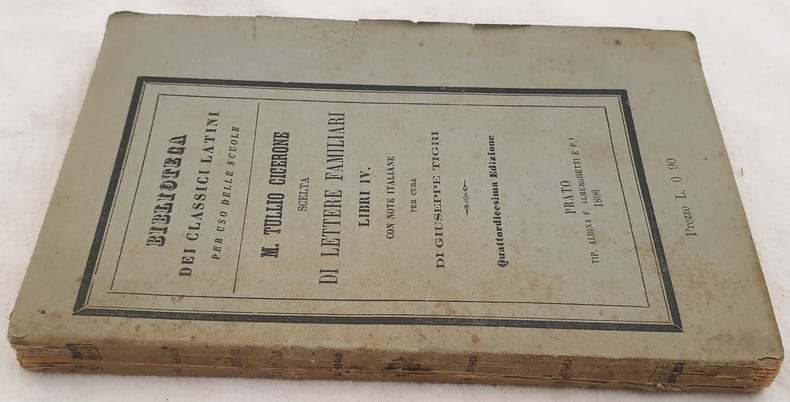 Edizione del 1896 di questa raccolta di lettere familiari di Marco Tullio Cicerone. Introduzione sulle lettere e la vita privata di Cicerone e note in italiano a cura di Giuseppe Tigri. Testo latino. In discrete condizioni. Coperta editoriale in buone condizioni generali con lievi usure ai margini e dorso. Legatura in discrete condizioni con rotture. All'interno le pagine si presentano in ottime condizioni con rare fioriture. In 8. Dim. 19x12,5 cm. Pp. XXXIII+151.Edition of 1896 of this collection of family letters by Marco Tullio Cicerone. Introduction about the letters and private life of Cicerone and notes in italian by Giuseppe Tigri. Latin text. In fair conditions. Editorial cover in good general conditions lightly worn in the extremities. Binding in fair conditions with cracks. Pages are in very good conditions with occasional foxing. In 8. Dim. 19x12,5 cm. Pp. XXXIII+151.<BR><BR>