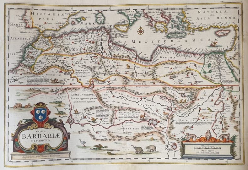 TiTOLO: Nova Barbariae descriptio from Nieuwen Atlas Amstelodami, Sumptibus Joannis Janssonii 1650 circa Dimensioni del foglio: 485 x 600 mm. Dimensioni dell'incisione: 355 x 525 mm. Tecnica: incisione su rame Condizioni generali: Eccellenti rare fioriture. Meravigliosa mappa del Nord Africa di grandi dimensioni acquarellata a mano tratta dall'Atlante "Nieuwen Atlas" [translation: The New Atlas], di Jan Jansson, pubblicata ad Amsterdam nel 1650 circa. La mappa mostra anche l'odierno Marocco, Algeria, Tunisia, Libia, Egitto. Titolo decorato con elaborato cartiglio e illustrazioni dell'interpretazione europea della flora e fauna africana. Descrizione completa dell'Egitto e Nord Africa in lingua latina al verso. Jan Jansson, celebre cartografo, appartenente ad una lunga stirpe di stampatori attivi a partire dal XVII secolo. Si stabilirono prima ad Arnhem poi ad Amsterdam. Furono stampatori di mappe, di libri e librai. Title: Nova Barbariae descriptio from Nieuwen Atlas Amstelodami, Sumptibus Joannis Janssonii 1650 circa Sheet size: 19.09 x 23.62 in; 485 x 600 mm. Plate area: 13.98 x 20.67 in; 355 x 525 mm. Technique: Copper engraving Overall condition: Excellent condition, with light foxing. A wonderful large scale hand-colored map of North Africa, from one of the great early 17th-century Atlas "Nieuwen Atlas" [translation: The New Atlas], by Jan Jansson, published in Amsterdam in 1650 circa. The map shows what is now Morocco, Algeria, Tunisia, Libya, Egypt. Elaborately decorated title and illustrations of European interpretations of african flora and fauna. Complete description of Egypt and North Africa in latin language in the verso. Jan Jansson was part of an influential family of map publishers from the Netherland throughout the 17th century and beyond. They were based in Arnhem than in Amsterdam. They were printers, publishers and booksellers. Overall Condition: Excellent