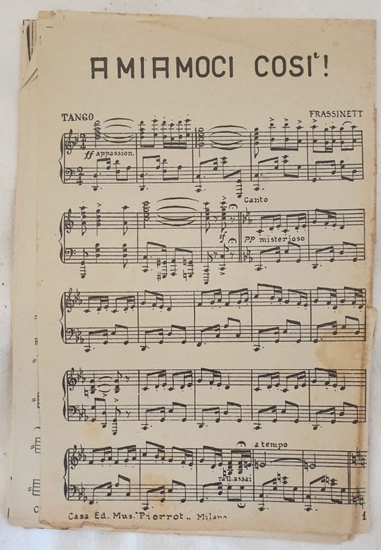Bello spartito, partitura completa per orchestra degli anni '30 di una canzone.<BR>Copertina mancante. GENERE: Tango STRUMENTI: pianoforte, violino, cello, contrabasso, clarino, flauto, trombone, batteria, tromba ANNO: anni '30 DIMENSIONI: In 8. cm 25x17 PAGINE: 11 CONDIZIONI: In buone condizioni NOTE: Ex libris alla prima paginaBeautiful score of one song, a complete score for orchestra of 1930's. <BR>Cover is missing. MUSIC: Tango STRUMENTI: piano; violin; cello; contrabbass; flute; clarion; trombone; drums, trumpet YEAR: 1930's SIZE: In 8. cm 25x17 PAGES: pp. 11 CONDITIONS: In good conditions NOTES: ex libris in the first page