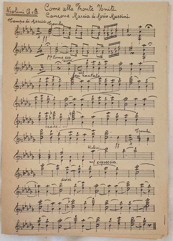 Bello spartito, partitura per orchestra degli anni '30 di una canzone.<BR>Copertina mancante. GENERE: Marcia STRUMENTI: violino, violoncello, batteria, basso, cornetta, clarino, flauto ANNO: anni '30 DIMENSIONI: In 8. cm 25x18 PAGINE: 9 CONDIZIONI: In buone condizioni NOTE: Ex libris alla prima paginaBeautiful score of one song, a complete score for orchestra of 1930's. <BR>Cover is missing. MUSIC: March STRUMENTI: violin; violoncello; bass; drums, flute; horn, clarion; flute<BR>YEAR: 1930's SIZE: In 8. cm 25x18 PAGES: pp. 9 CONDITIONS: In good conditions NOTES: ex libris in the first page