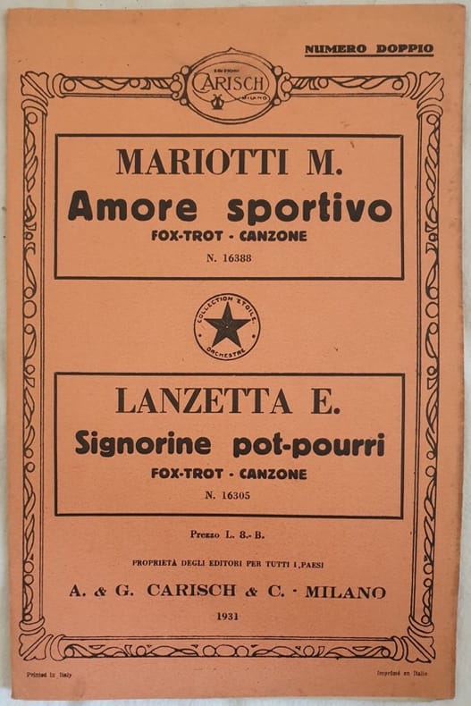 Bello spartito, partitura per orchestra del 1931 di due canzoni.<BR>Copertina editoriale illustrata. GENERE: Fox trot STRUMENTI: pianoforte, violino, violoncello, sassofono, flauto, tromba, trombone, contrabasso, sassofono, clarinetto, batteria ANNO: 1931 DIMENSIONI: In 8. cm 27x18 PAGINE: 38 CONDIZIONI: In ottime condizioni. NOTE: Ex libris alla prima pagina. Beautiful score of one song, a complete score for orchestra of 1931 of two songs. Editorial cover. MUSIC: Fox trot STRUMENTI: piano, violin; violoncello; saxophone, flute, trumpet, trombone, contrabass, saxophone, clarinet, drums YEAR: 1931 SIZE: In 8. 27x18 PAGES: pp. 38 CONDITIONS: In very good conditions. <BR>NOTES: ex libris in the first page<BR><BR>