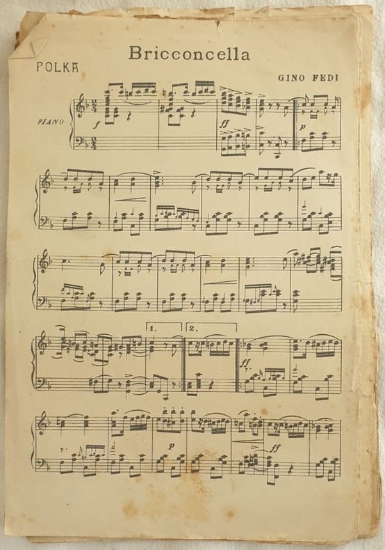 Partitura per orchestra del 1930 delle melodie "Bricconcella" di Gino Fedi e "El irresistible tango".<BR>Copertina assente. GENERE: Polka STRUMENTI: pianoforte, violino, clarinetto ANNO: anni '30 DIMENSIONI: In 8. cm 29x19,5 PAGINE: pp. 8 CONDIZIONI: Discrete condizioni. Score for orchestra of 1930's of the melody "Bricconcella" di Gino Fedi e "El irresistible tango". Editorial cover lacks. MUSIC:Polka STRUMENTI: piano, violin, clarinet YEAR: 1930's SIZE: In 8. cm 29x19,5 PAGES: pp. 8 Fair conditions