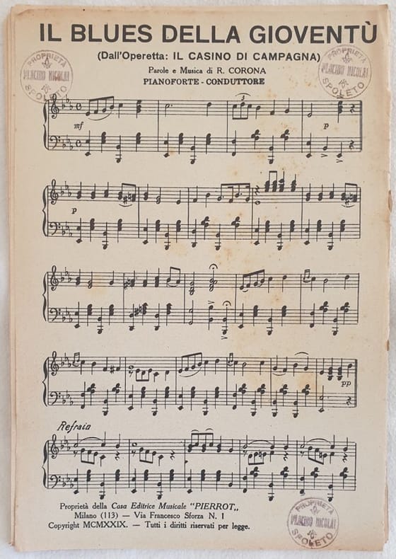 Partitura per orchestra del 1929 della melodia di R. Corona "Il blues della gioventu" dall'operetta "Il casino di campagna". Copertina assente. GENERE: One step STRUMENTI: pianoforte, violino, violoncello, flauto, clarinetto, tromba, trombone, contrabasso ANNO: 1929 DIMENSIONI: In 8. cm 25,5x18 PAGINE: pp. 10 CONDIZIONI: Discrete condizioni. Ex libris in copertina. Score for orchestra of 1930's of the melody of R. Campa "Il blues della gioventu" dall'operetta "Il casino di campagna". Cover lacks. MUSIC: One step STRUMENTI: piano, violin, violoncello, flute, clarinet, trumpet, trombone, contrabass<BR>YEAR: 1929 SIZE: In 8. cm 25,5x18 PAGES: pp. 10 CONDITIONS: Fair conditions. Ex libris in the cover <BR><BR>