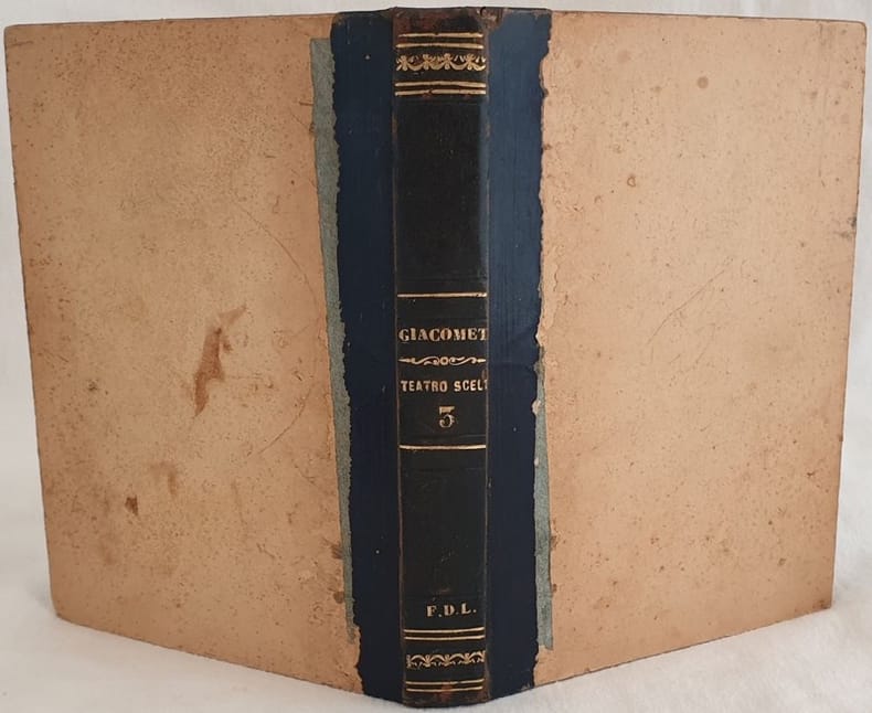 Edizione del 1861 di questa raccolta di commedie del commediografo Paolo Giacometti (1816-1882) nato a Novi Ligure. Giacometti si trasferì a Genova un anno dopo la sua nascita. Tomo terzo solamente. Le commedie presenti all'interno: Bianca Maria Visconti, Le metamorfosi poetiche, Siamo tutti fratelli! ossia il villaggio e la città, Il fisionomista, La trovatella di Santa Maria, Il milionario e l'artista, Cola di Rienzo ecc... In buone condizioni. Copertina in mezza pelle coeva con titolo in oro al dorso in discrete condizioni con lievi usure marginali. Carta mancante ai piatti. Legatura in buone condizioni. Pagine in buone condizioni con fioriture. In 8. Dim. 22,5x16 cm. Pp. 478. Peso Kg. 0,550<BR><BR>