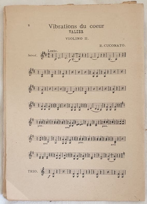 Partitura per orchestra degli anni '30 delle melodie "Vibrations du coeur" di R. Cuconato e "Minuetto" di Nicola Romano. Copertina assente. GENERE: Valzer, Minuetto<BR>STRUMENTI: pianoforte, violino, cello, flauto, contrabasso, clarino, trombone, oboe, corni, batteria<BR>ANNO: anni '30 DIMENSIONI: In 8. cm 25,5x17,5<BR>PAGINE: pp. 32 CONDIZIONI: Discrete condizioni. Copertina assenteScore for orchestra of 1930's of the melodies "Vibrations du coeur" by R. Cuconato and "Minuetto" by Nicola Romano. Cover lacks. MUSIC: Valzer, Minuetto STRUMENTI: piano, violin, cello, flute, clarinet, trombone, contrabass, oboe, horns, drums<BR>YEAR: 1930's SIZE: In 8. cm 25,5x17,5 PAGES: pp. 32 CONDITIONS: Fair conditions. Ex libris in the cover