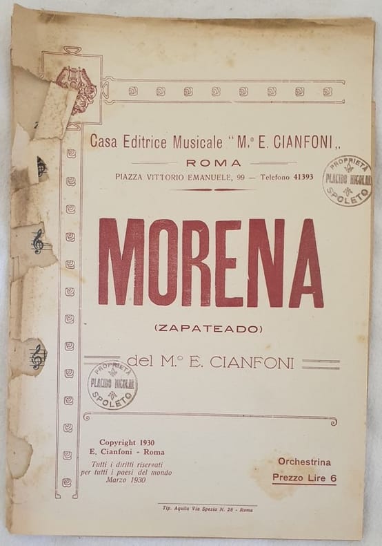 Partitura per orchestra del 1930 della melodia di E. Cianfoni "Morena". Copertina morbida editoriale.<BR>GENERE: Zapateado STRUMENTI: pianoforte (una pagina), violini; contrabasso, clarinetto, sassofono, flauto, oboe ANNO: 1930 DIMENSIONI: In 8. cm 27,5x18<BR>PAGINE: pp. 8 CONDIZIONI: Discrete condizioni. Usure marginali e piatto posteriore assente. Ex libris in copertina Score for orchestra of 1930 of the melody of E. Cianfoni "Morena". Editorial soft cover. MUSIC: Zapateado STRUMENTI: piano (one page), violin; contrabbass, clarinet, timpano, saxophone, flute, oboe YEAR: 1930 SIZE: In 8. cm 27,5x18 PAGES: pp. 8 CONDITIONS: Fair conditions. Worn extremities and back plate lacks. Ex libris in the cover