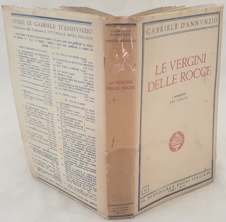 Edizione del 1941 del romanzo "Le vergini delle rocce" dello scrittore, poeta, drammaturgo, politico e giornalista Gabriele D'Annunzio (1863-1938). Volume n. 15 della collana edita dalla fondazione "Il Vittoriale degli italiani". In ottime condizioni. Brossura editoriale in ottime condizioni generali con lievi usure ai margini e dorso. Pellicola protettiva con strappi e mancanze. Legatura in buone condizioni. All'interno le pagine si presentano in ottime condizioni con rare fioriture. In 8. Dim. 22,5x16,5 cm. Pp. 144+(1). Edition of 1941 of the novel "Le vergini delle rocce" by the writer poet dramawriter politician and journalist Gabriele D'Annunzio (1863-1938). Volume n. 15 of the series edited by the fondation "Il Vittoriale degli italiani". In very good conditions. Editorial cover in very good general conditions slightly worn in the extremities. Binding in good conditions. Inside pages are in very good conditions with occasional foxing. In 8. Dim. 22,5x16,5 cm. Pp. 144+(1).