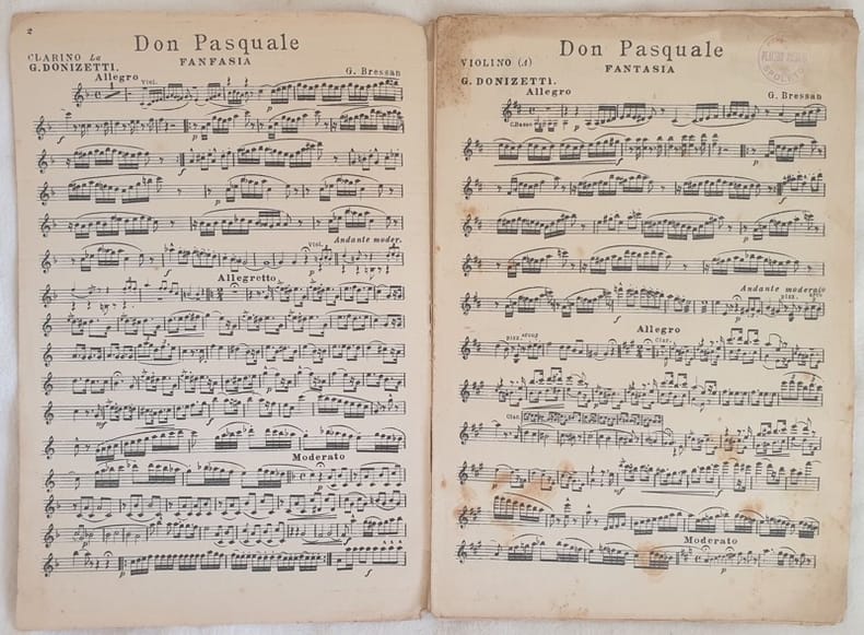 Partitura completa per orchestra degli anni '30 della melodia di Donizetti e G. Bressan "Don Pasquale".<BR>Copertina assente. GENERE: Fantasia STRUMENTI: violini; cello; basso, viola, tromba, trombone, flauto, clarino, batteria ANNO: anni '30 DIMENSIONI: In 4. cm 29x20<BR>PAGINE: pp. 27 CONDIZIONI: Buone condizioni. Ex libris in copertina. Legatura assenteComplete score for orchestra of 1930's of the melody of Donizetti and G. Bressan "Don Pasquale". Cover lacks MUSIC: Fantasia STRUMENTI: violin; cello; bass, viola, trumpet, trombone, flute, clarion, drums<BR>YEAR: 1930's SIZE: In 8. cm 29x20 PAGES: pp. 27 CONDITIONS: Good conditions. Ex libris in the cover
